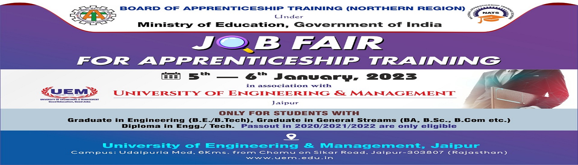 Job Fair for Apprenticeship Training" at Jaipur, Rajasthan on 5th & 6th January, 2023